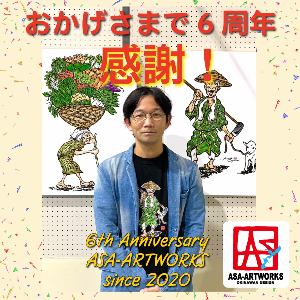 おかげさまで6周年! 写真は第77回沖展グラフィックデザイン部門で入選した作品「ハルサーオジー」と「バーキオバー」と一緒に。 アサアートワークスは2020年4月創業から皆さまに支えられ6周年を送ることができました! 子供の頃から大好きだった絵を描くことから始まり、今も絵を描くこと媒体にTシャツやデザインのお仕事を続けられることに大変喜びと感謝を感じております。 7年目も楽しみながらも、日々精進を忘れず、アサアートワークスは進み続けます! 今年度もよろしくお願いします。